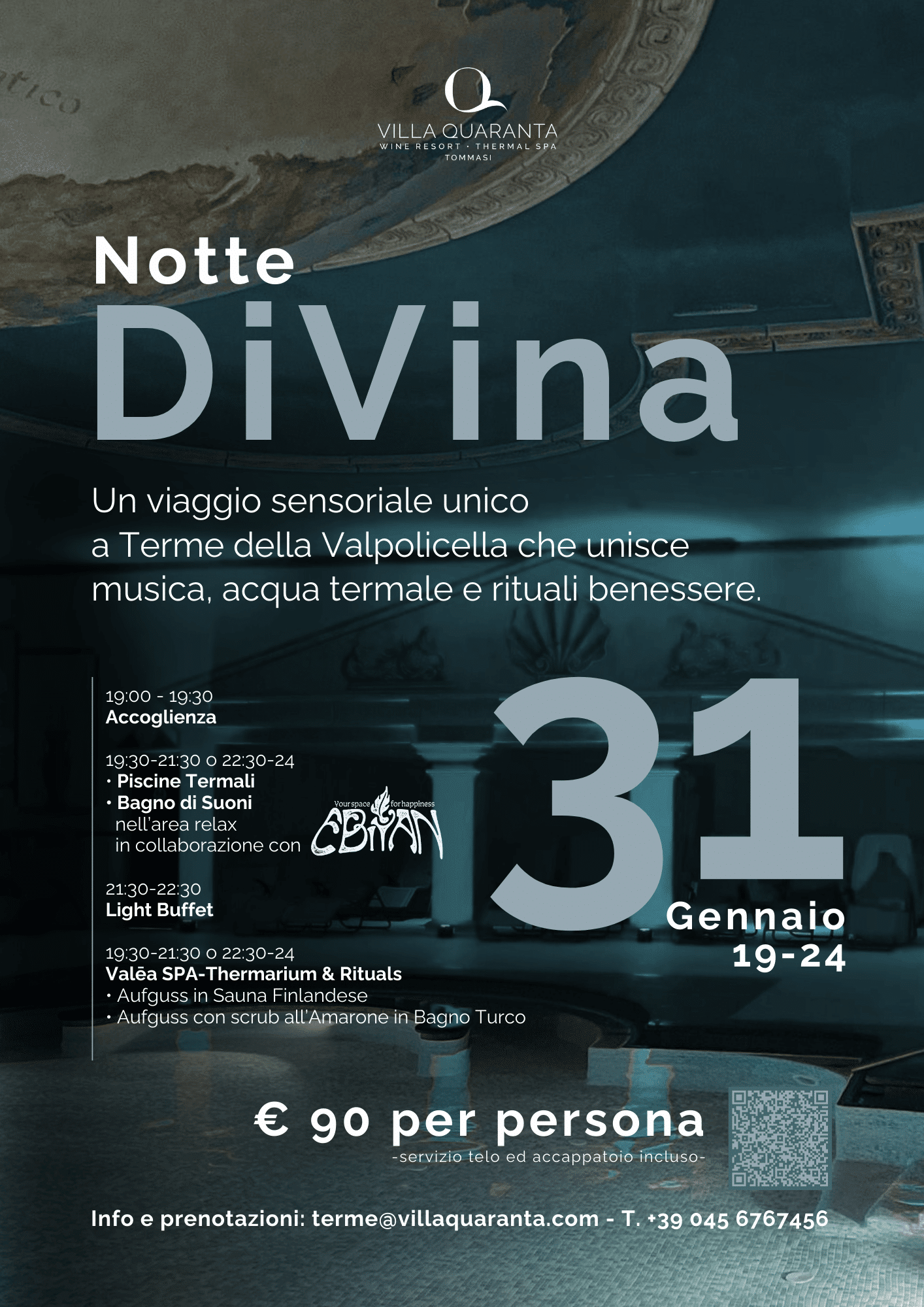 Il 31 Gennaio 2026, a Terme della Valpolicella, torna la Notte DiVina: un evento esclusivo dove musica, acqua e benessere si fondono in un’esperienza unica e indimenticabile. Dalle 19:00 alle 24:00, gli spazi della SPA si accendono di luce, suoni e calore per un viaggio sensoriale pensato per rigenerare corpo e spirito.