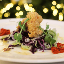 • Insalata di cavolo bianco e rosso con vinaigrette alle acciughe del Cantabrico e trancio di merluzzo in tempura
