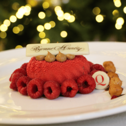 • “Incanto” realizzato dallo Chef Pâtissier Cristiano Castellini: Biscuit al Philadelphia e lamponi, chantilly al cioccolato fondente, pralinato croccante, gelée ai lamponi e mousse al cioccolato Amber al caramello