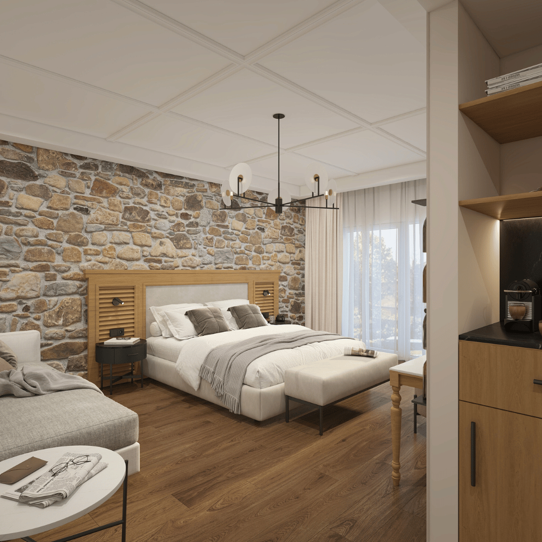 La luce naturale, materiali caldi e dettagli unici richiamano la terra e il vino della Valpolicella, creando un’atmosfera intima e armoniosa.